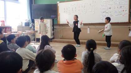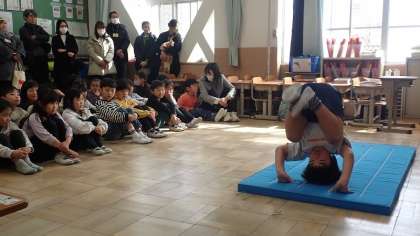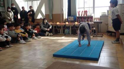 今日は、小学校に入学してからの1年間でできるようになったことをみんなの前で発表する「きらきら はっぴょうかい」を行いました。発表したのは、「なわとび」「冬のあそび」「音読」「マット」「英語」など様々です。