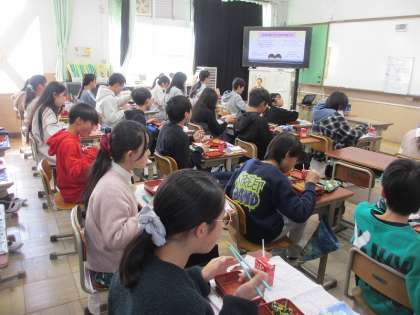 今日の中学校給食試食体験学習を通して、中学校給食が育ち盛りの中学生に不足しがちな栄養をしっかり補い、バランスの良い食事ができるように考えられていることを知りました。また、実際に中学校給食を試食してみて、中学校給食へのイメージをもつことができたと思います。どんな感想をもったか、ぜひご家庭で聞いてください。