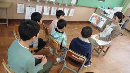 「このかべどうする?」「かける」の2冊の絵本を読み語りしてくださいました。子どもたちは、食い入るように絵本を見つめ、お話に引き込まれています。「問いかけ」のあるお話に対して、自分なりに「こうする!」「ああする!」と考えながら聞く姿が素敵でした。