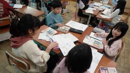 町たんけんをして発見したことを発表するために、グループごとに準備をしています。「作戦会議」をしたり、自分のまとめづくりをしたりしています。