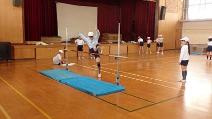 はじめはゴムをとび越すところから学習を始めましたが、とび越すことのできるバーの高さがだんだん上がってきました。リズムよく助走して踏み切ることができると、力をうまく上向きに伝えることができるようになります。バーをとぶフォームもかっこよくなってきました。