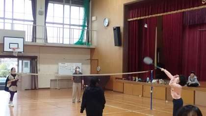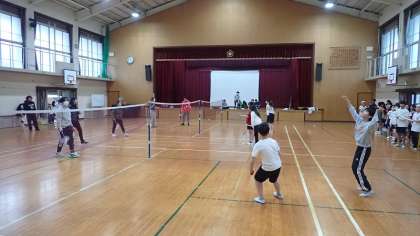 体育館にコートを3面つくり、先生ペアとの5点先取の特別試合を行いました。限られた活動時間でしたが、子どもたちは意欲的に練習して上達してきました。前後の揺さぶりに弱い先生チームの弱点を突く戦術で先生チームを追い込む子どもたちもいました。時には先生の容赦ないスマッシュやライン際をねらったショットに苦しみつつ、楽しく試合をすることができました。