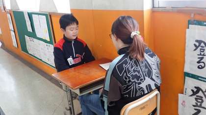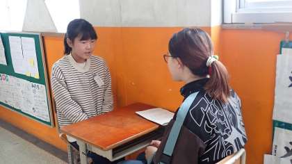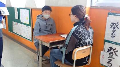 ALTの先生との会話を通して、これまでに学習した表現を使って、英語で自分の思いを伝えることができるかを確かめます。ちょっと緊張しながらも、ALTの先生の話すことを聞き取り、英語で答えていました。