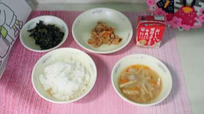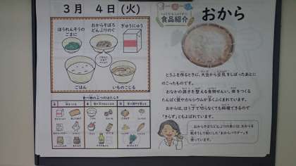 「おからそぼろ丼」は、子どもたちが大好きな丼の献立です。鶏ひき肉にしょうがを加えて炒め、そこに細かく刻んだしいたけ、たまねぎ、にんじんを加えて炒めます。よく炒めた後にさとう・みりん・しょうゆで味付けし、さらにおからパウダーを加えて炒りつけています。甘く味付けされたおからそぼろがごはんにぴったりで、ごはんにのせておいしくいただきました。