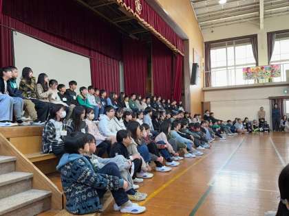 この1年間、梅津小学校をリードし、様々な場面で活躍するかっこいい姿を見せてくれた6年生へ、「切手のないおくりもの」のメロディにのせて感謝のメッセージを伝えました。その後、中学校に進学する6年生へのエールを込めて、「チャレンジ」の歌を贈りました。