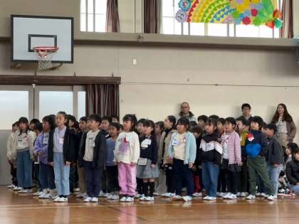 1年生が入学した時から、6年生のお兄さん、お姉さんはずっと関わり続けてくれました。1年生が学校生活に慣れたあとでも、ずっと6年生は1年生のことを気にかけ続けてくれました。そんな6年生に、1年生らしく明るく元気な歌声で歌を贈りました。6年生の子どもたちも、笑顔で聞いていました。