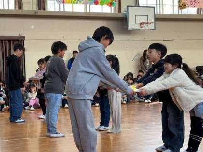 1〜5年生からの出し物が終わった後は、たてわりグループの6年生に感謝のメッセージを書いたプレゼントを渡しました。在校生を代表して、1年生から6年生に手渡しました。