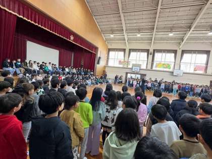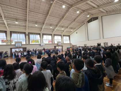 6年生が社会見学で学校にいない日に、全校のみんなでこっそり練習しました。体育館いっぱいに、およそ400人のやわらかい歌声の「ありがとうの花」が咲きました。