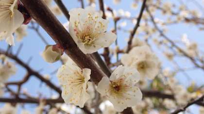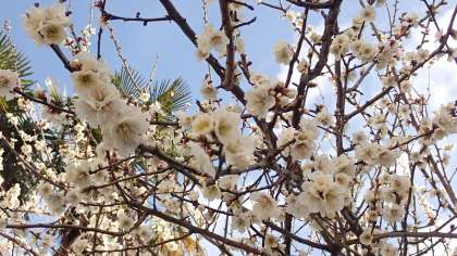 開花が遅れていた梅津小学校の梅の花ですが、今週になっていよいよ花を咲かせはじめました。正門横の白梅は、たくさんの花を咲かせています。