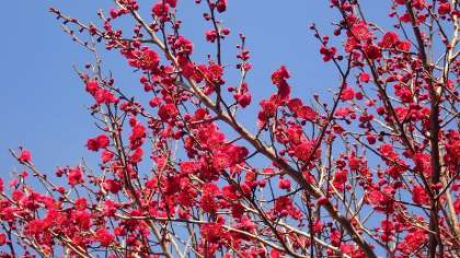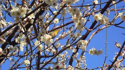中庭の紅梅も、たくさん花を咲かせました。梅の花の香りに誘われて、メジロもやってきました。