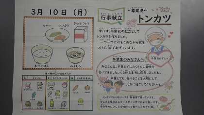 今日は、6年生の卒業をお祝いする「卒業祝献立」です。6年生の卒業のお祝いとして、トンカツには給食調理員さんが1枚1枚心を込めて衣をつけ、油で揚げてくださいました。甘みのあるソースをつけて、味わっておいしくいただきました。「ソテー」は、キャベツの甘みがよく出ており、トンカツとの相性もぴったりでした。