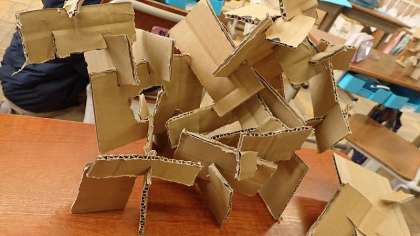 段ボール板を組み合わせて、思い思いの作品づくりをしています。組み合わせたり友達と見合ったりする中でさらに思いが広がり、ダイナミックの作品が完成しました。