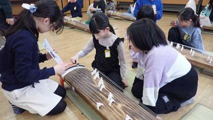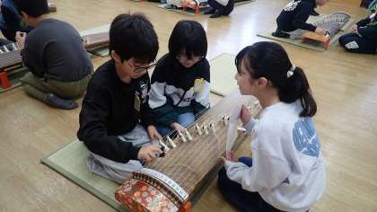 今日は、日本古謡の「さくら さくら」を箏で演奏しました。4年生の子どもたちは、本物の箏に興味津々です。楽譜も、普段見慣れた五線譜とは違うもので、「七・七・八〜」と譜を読みながら、楽しそうに演奏していました。