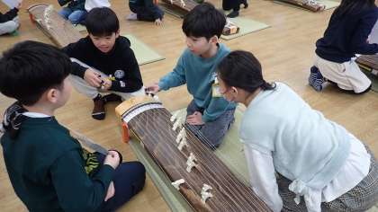 今日は、日本の楽器である「箏(そう・こと)」に触れる学習をしました。「お琴」と呼ばれることの多い楽器ですが、正しくは「箏」と書き、箏の胴の上に立てられた「柱(じ)」という可動式のブリッジを動かして音の高さを決めるのが特徴です。