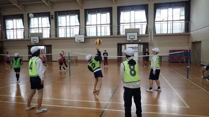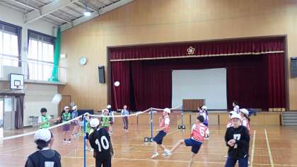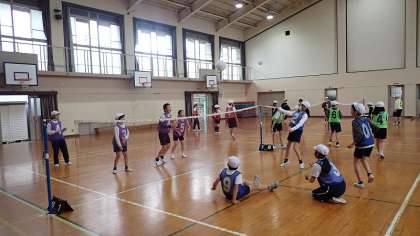 5年生は、体育の「ソフトバレーボール」の学習をしています。