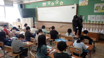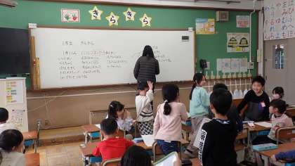 1年生は、学級活動で学級目標のふり返りをしていました。