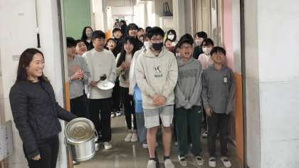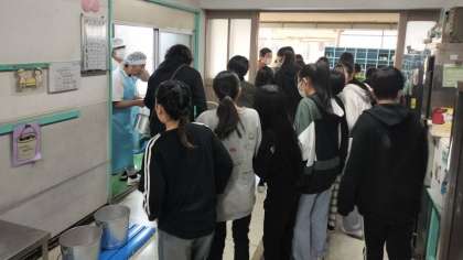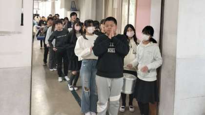 空っぽになった食缶をもって、6年生全員で給食調理員さんにお礼を伝えに行きました。この6年間で、約1,120回ほどの給食を食べました。1,120回分の「ごちそうさまでした」が、給食調理員さんに届いたと思いますよ。