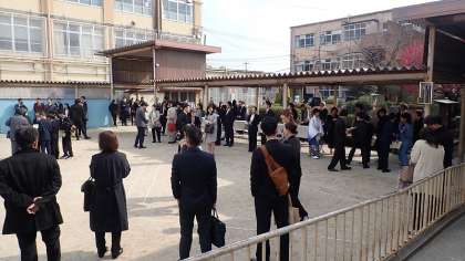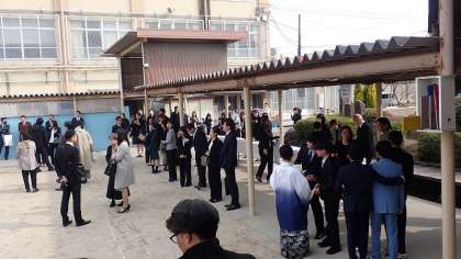 水曜日までの寒さもいくぶん和らぎ、気持ちのよい青空が広がりました。受付開始の時刻になると、卒業生が登校してきました。小学校生活6年間で、最後の登校です。