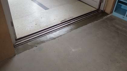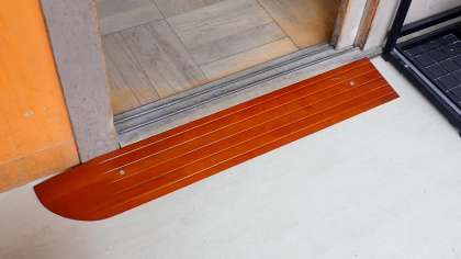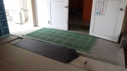 北校舎の1階に車いす等で入る際に妨げとなっていた段差を解消するために、スロープの設置を行っています。校舎の入り口には、鉄製のスロープを設置したり、モルタルでスロープをつくってもらったりしています。教室の入り口にも、木製のスロープを設置してもらいました。