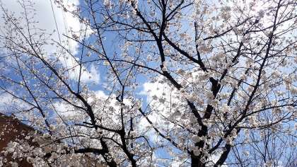 中庭の桜の木には、たくさんの花が咲き始めています。枝の先の方にはまだつぼみもあり、満開はもう少し先になりそうです。