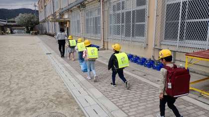 運動場では下校のコースごとに整列し、引率の先生と一緒に下校しました。道路を歩く時には、路側帯や歩道の中を通って安全に歩くことができました。