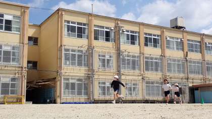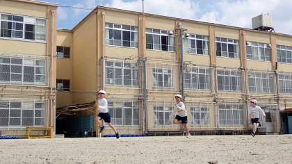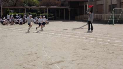 3クラスの子どもたちが1人ずつ並んで50m先のゴールめざしてまっしぐらに走ります。3年生のときよりも、力強い走りです。3年生のときと比べて、タイムはどれくらい縮まったかな?