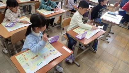 1年生は、算数の「わくわく すたあと」の学習をしています。