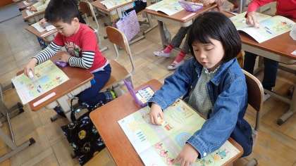 教科書の挿絵の上に「数図ブロック」を置いて、いくつあるかを数えています。先生の話をよく聞いて自分でブロックを並べ、「できた!」と嬉しそうにしていました。