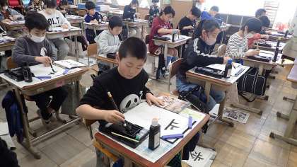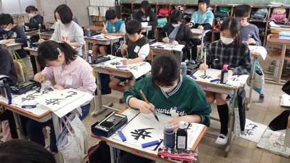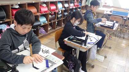 6年生になって初めて毛筆で書くのは、「歩む」の2字です。漢字とひらがなのバランスや、筆づかいに気をつけて書いています。みんな集中しているので教室がとても静かで、緊張感をもって書いていました。