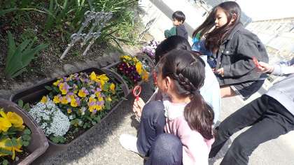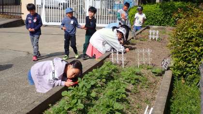 虫めがねを手に、学校の花壇や畑などに咲いている花や虫の様子を観察しています。虫めがねを使うと、目で見るよりも観察したいものを大きく見ることがで、詳しく様子を観察することができます。きみんな夢中になって観察していました。