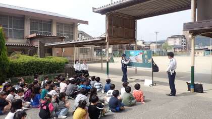 小学校に入学して1週間が経ちました。毎日、集団登校、集団下校をしていますが、23日からは子どもたちだけで下校するようになります。安全な学校の行き帰りのため、お巡りさんから安全な道路の歩き方を教えていただきました。