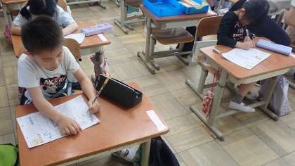今日学習したひらがなは「ち」です。筆順や字の形に気を付けてていねいに書いています。ていねいに書こうとすると、どうしても手に力が入ってしまいます。家での宿題でも書いているうちに手が痛くなってくるかもしれません。様子を見ていただき、力が入っているようであれば、ひとことお声掛けください。