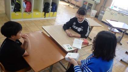 むくのきの教室では、漢字の書かれたカードを見て、どんな意味のなんという感じかを答える活動に取り組んでいました。