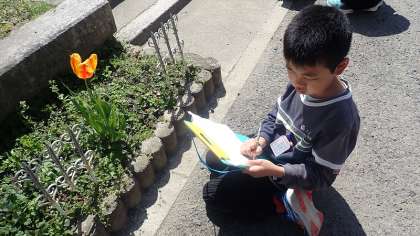 3年生は、交流学級の友達と一緒に、理科の植物の観察をしています。花の形や歯の様子を詳しく観察しながら、チューリップの様子をかいていました。