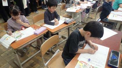 「迷子の子どもをさがすお知らせ」の放送を聞き、たくさんの人がいる教科書の絵を見て、迷子の友達を探す活動に取り組みました。すべての内容を書き留めることができないので大事なことだけに絞ってメモを取ることが必要になります。担任の先生のが読む放送を聞いて、自分なりにメモを取りました。
