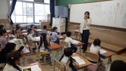 学習したのは、国語の「ひらがなのれんしゅう」をしています。今日は「う」を学習しました。文字を正しく書くために、4つに分けたどの部屋から書き始めるのか、書き順はどうかを確かめながら書きました。今日のポイントは、2画目の「はらい」でした。書くことができたら、手を挙げて先生にまるをつけてもらいました。