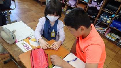 直方体や立方体のかさである体積を求めるには、どのように考えるとよいかについて考えています。子どもたちは、面積の学習の経験を生かして、「たて×よこ×高さ」で求めることができそうだと予想を立てました。本当にこの考え方でよいか、1立方センチメートルのブロックを積み上げて確かめています。