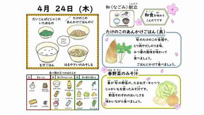 「たけのこのあんかけごはん」は、旬のたけのこの食感や、鶏肉や山車のうまみ、三つ葉の風味を味わっていただきました。「春野菜のみそ汁」には、春が旬のたまねぎ、キャベツ、じゃがいもが入っています。それぞれの野菜のおいしさを味わっていただきました。