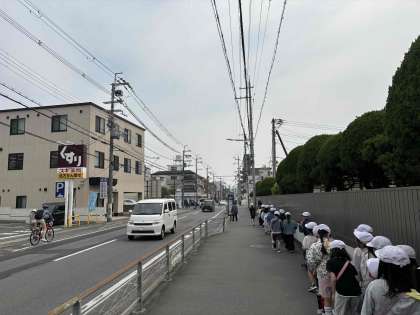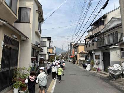 校区には、どんな場所があり、どんな様子になっているのかを調べるために校区探検へ出かけました。「ここはお家やマンションが多いな。」「四条通りはお店や人が多いな。」「この建物は何かな?」と気になったことや不思議に思ったことを話しながら梅津の町を歩きました。さらにもっと詳しく知るために来週も町たんけんへ出かけます。また、新たな発見があるといいですね。