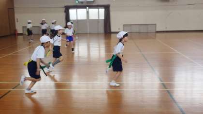 今日は、「しっぽとり」をしました。ペアの友達と向かい合ってしっぽを取り合ったり、体育館でみんなで一斉にしっぽ取りをしたりしました。自分のしっぽは取られないようにしながら、友達のしっぽをねらって体育館を駆け回っていました
