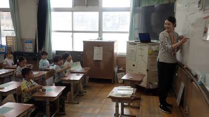 今日は、「水書筆」を使って線や文字を書きました。水書筆を使うことで、「とめ」や「はらい」を意識して書くことができるようになります。はじめは、初めて触れる水書筆に夢中になって線を書いていましたが、文字を書く時には、「とめ」と「はらい」を意識して書くことができました。鉛筆で文字を書く時にも、いつも意識できるとよいですね。