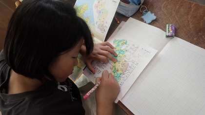 京都府の土地はどのような様子をしているかを確かめながら、白地図に色を塗っていきます。作業を進めていく中で、京都府の中部から北部にかけて高い土地が多いことに気付きました。また、比叡山や皆子山などの標高の高い山があることも知りました。