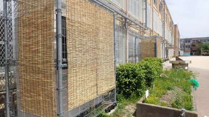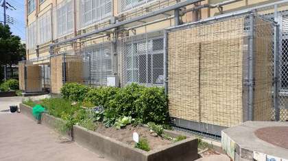 今日から5月に入りました。今日も、日ざしの下では暑さを感じるくらいでした。これから気温も上がり、どんどん夏が近づいてきます。子どもたちの学習する教室を快適に保つエアコンですが、室外機に当たる日光を少しでも緩和するために「すだれ」を取り付けています。