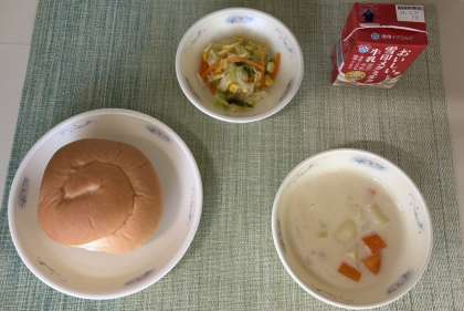 「じゃがいものクリームシチュー」の「ルー」は、給食調理員さんの手作りルーです。今日も、給食室からバターのいいにおいが漂ってきていました。コクたっぷりでまろやかなおいしいルーと一緒に、じゃがいもや鶏肉などたくさんの具材をおいしくいただきました。