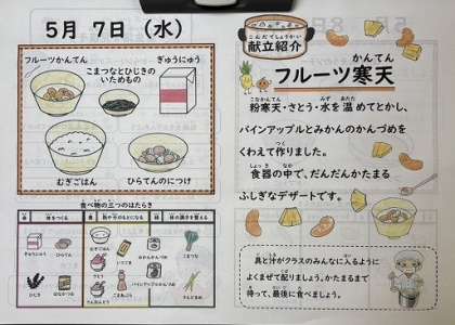 「フルーツ寒天」は、子どもたちが楽しみにしていたデザートです。粉寒天、さとう、水をあたためてとかし、パインアップルとみかんの缶詰を加えてつくっています。配っているときはさらさらの水のようなのに、おかずを食べているうちにだんだん固まってくる不思議なデザートです。1年生の子どもたちには初めての「フルーツ寒天」でした。ぜひ、ご家庭でも感想を聞いてください。