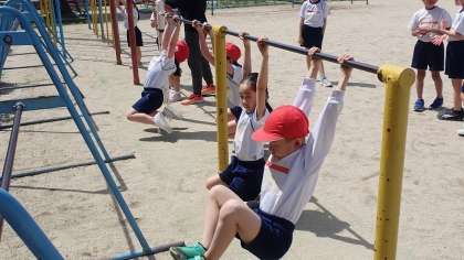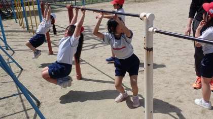 みんなで「ぶらさがりふり」の技に挑戦しています。何回体をふることができるかを数えながら挑戦していました。