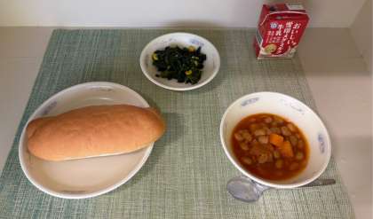 「大豆と鶏肉のトマト煮」は、さっぱりしたトマト味の酸味が魅力の献立です。鶏肉がとてもやわらかく調理されていて、ふっくらした食感の大豆と一緒においしくいただきました。「大豆と鶏肉のトマト煮」の赤と、「ほうれん草のソテー」の緑と黄色が見た目にも鮮やかな献立でした。