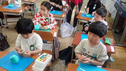 みんなが食べたくなるようなおいしいごちそうを、今日は粘土でつくりました。かたまりの粘土をぐっと圧してやわらかくして、つくりたいものを表現しました。お寿司、フライドポテトなど、うまく表現していました。何をつくったか、ご家庭でも聞いてみてください。