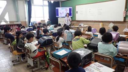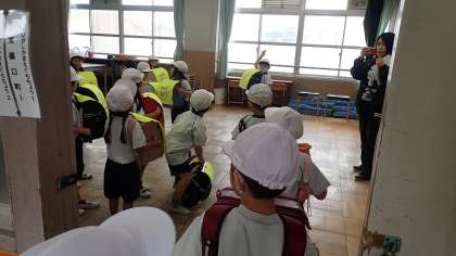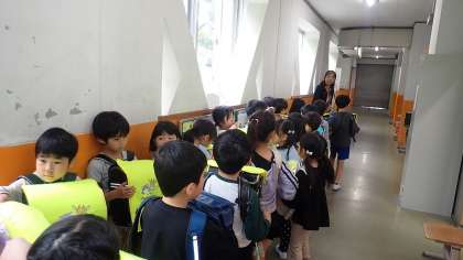 梅津小学校は桂川から近く、大雨によって桂川の氾濫が発生した場合は、学校も浸水する可能性があります。今日は、そういったときの避難の仕方を知り、実践しました。万一の時は「浮き」代わりになるランドセルをもち、2階以上の高さに垂直避難をします。先生の指示に従って、スムーズに行動することができました。