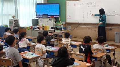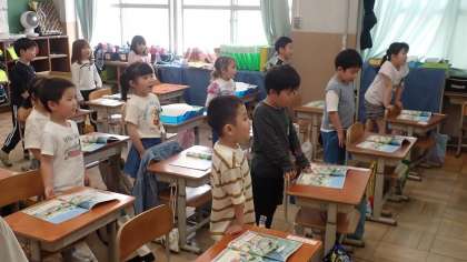 5月22日に行われる「1年生を迎える会」で、2〜6年生は1年生を歓迎する出し物をし、1年生は、それにこたえるお礼の出し物をします。今日は、クラスごとに出し物の歌の練習をしていました。みんなが知っている歌を一部替え歌にして歌うようです。みんな楽しそうに歌っていました。